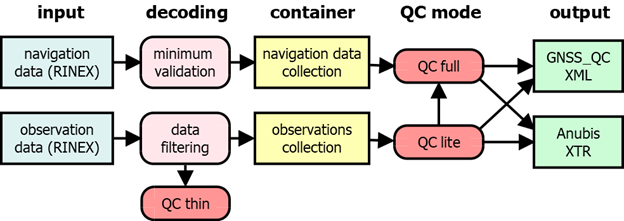 The quantitative control can be performed in a lite QC mode using observation data only. The qualitative and complex control requires a full QC mode, thus using observation and navigation data in addition including processing algorithms and some approximations. The figure depicts relations of different modes to relevant inputs and outputs.