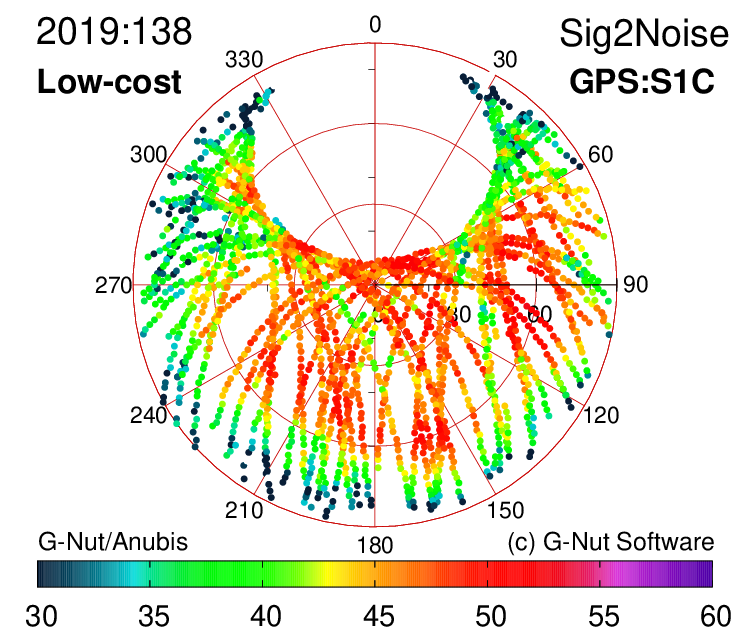 The qualitative data control relies on specific algorithms and requires information about satellite positions. This control characterizes an actual quality of GNSS data, however, the QC result depends on applied algorithms and approximations. Qualitative aspects include environmental effects (code multipath, obstructions), quality of receiver tracking (cycle slips, clock jumps) but also counts of theoretically expected observations and elevation histograms. Most of the procedures require satellite positions and observation azimuth and elevation angles. Figures show skyplots of example signal-to-noise ratio characteristics of different receivers/antennas, signals or site environments.