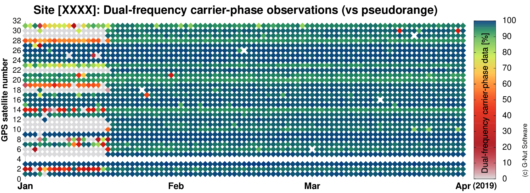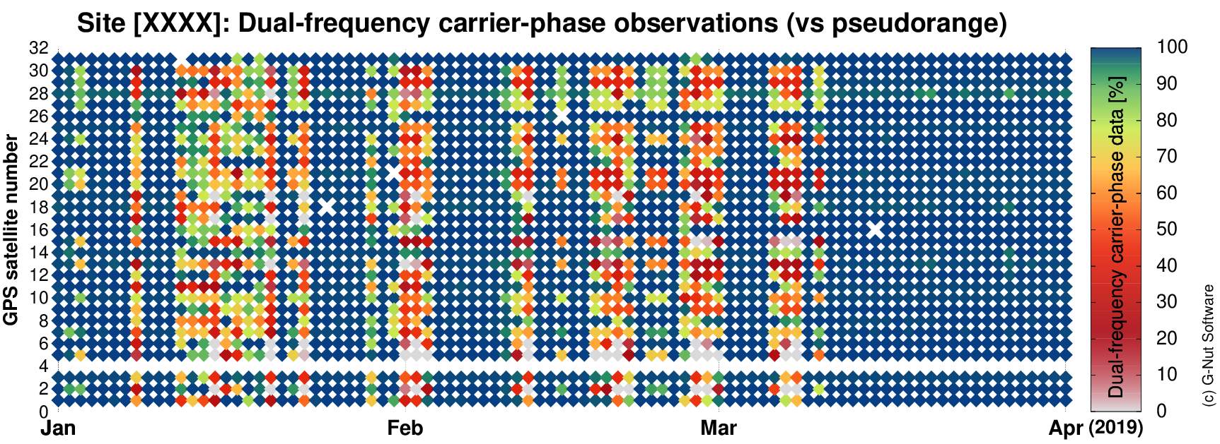 The quantitative data control relies on summarizing mechanically countable information, e.g. observed GNSS constellations, satellites, bands/frequencies, observation types/signals which all are most important to characterize the data content and its completeness (presence of data gaps, single-frequency observations etc). This can be estimated without use of algorithms and navigation data, and the QC result characterizes actual content of the file. Figure shows two examples of losses of dual-frequency carrier-phase observations for individual satellites during a three-month period.
