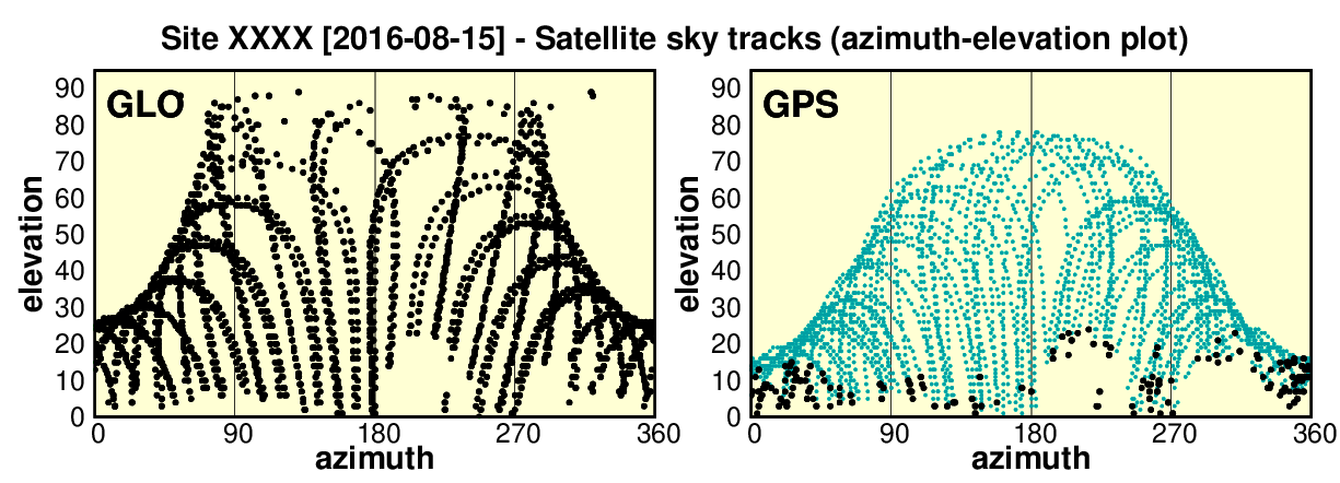 A single station QC analysis provides all details of the site performance, including its instrumentation and environment. Detailed QC plots can be created with a dedicated visualization tool (e.g. plot_Anubis.pl) if a comprehensive output is available from the QC full-mode analysis. A 24-hour data analysis provides sufficient information about site environment, signal obstructions, receiver tracking performance and its configuration, and others. Apparently, the most interesting outputs are skyplots with multipath and signal-to-noise ratio information, graphs of satellite visibility and site obstructions, observation availability and quality including tracking performance (single-/dual-/multi-frequency, signal interruptions, presence of data gaps or carrier-phase cycle slips etc). The figure shows an example of available dual-frequency (blue) and single-frequency (black) observations for GLONASS and GPS systems and two obstructions close to the horizon.
